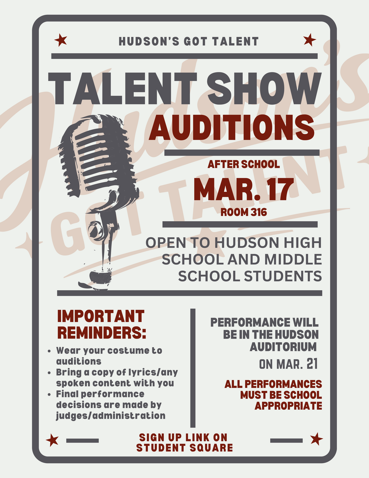 Hudson High School’s SkillsUSA chapter is excited to host Hudson’s Got Talent, a district‑wide talent show open to both middle school and high school students!